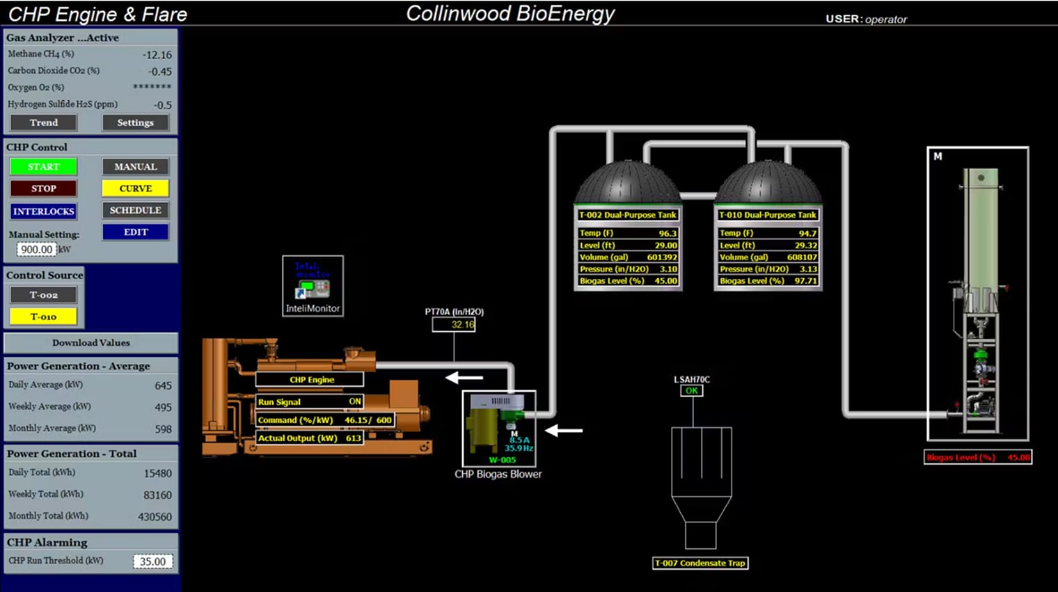 SmartSights WIN-911 remote alarm notification software monitors the pressure flows and optimal metrics for the temperatures, tank levels, volumes, pressure, and biogas levels in every piece of equipment in the anaerobic digestion process, which includes numerous roof blowers, desulfurization blowers, and pumps. Sensors in the equipment give information to the SCADA system and if there are any problems, WIN-911 will notify the plant operators via email and SMS alarms. Quasar soon will be upgrading to a more robust version of the software to ensure greater consistency.
