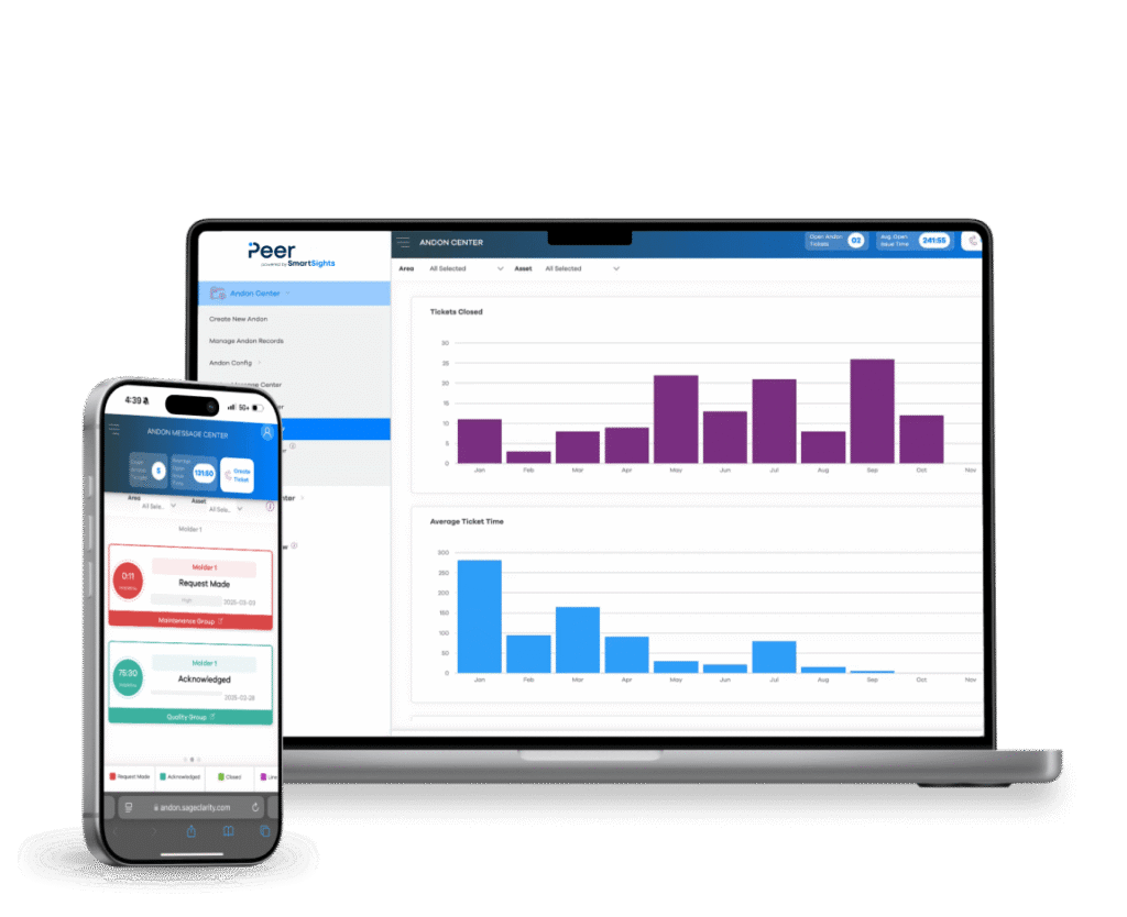 Peer streamlines issue management with an Andon-style message center for creating, viewing, and updating tickets. Keep teams aligned with clear priorities and faster follow-through across lines, areas, and sites.